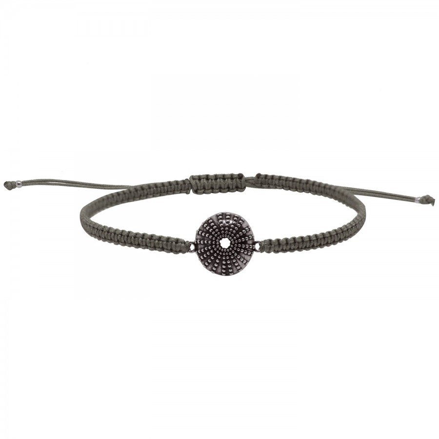Bracelet grigri homme en macramé sable orné d'un petit oursin plaqué argent, pour les passionnés de la plage et de ses trésors.