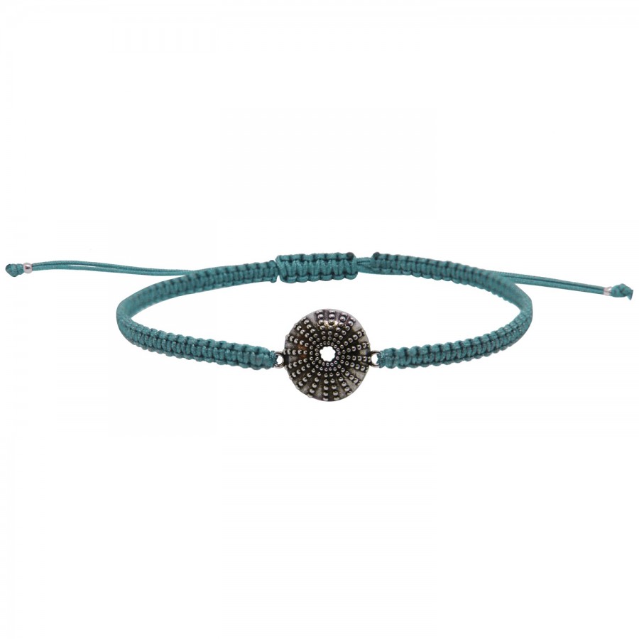 Bracelet grigri homme en macramé lagon orné d'un petit oursin plaqué argent, pour les passionnés de la plage et de ses trésors.