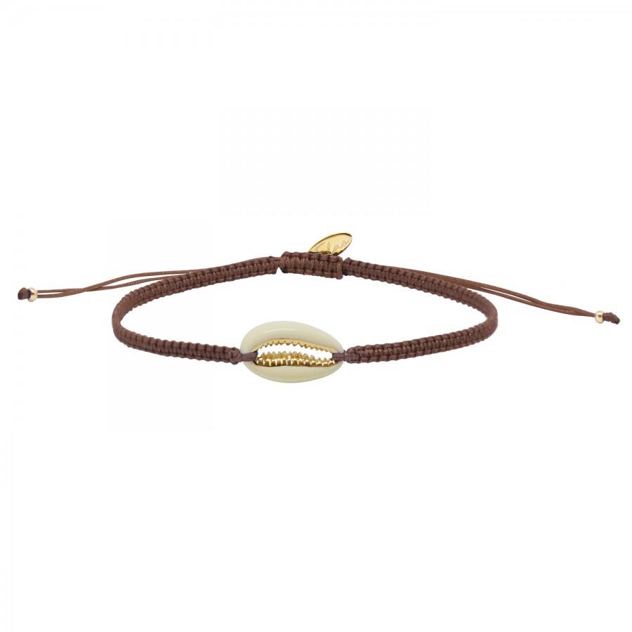 Véritable invitation au voyage, craquez pour le gri-gri rodrigues doré à l'or fin 24 carats aux douces tonalités de l'Océan Indien monté sur un macramé moka.