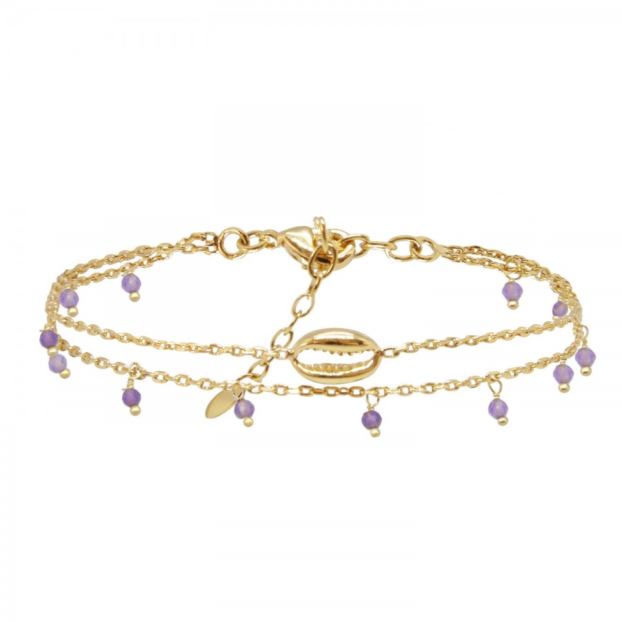 On aime le bracelet double little salty doré à l'or fin 24 carats orné de sa petite coquille bonheur qui nous rappelle la douceur salée des Iles et des delicates perles d'améthyste.