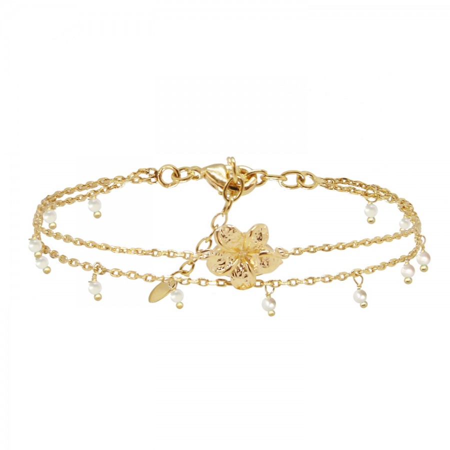 On aime le bracelet double frangipane doré à l'or fin 24 carats orné de sa petite fleur qui nous rappelle la douceur sucrée des Iles et des delicates perles d'eau.