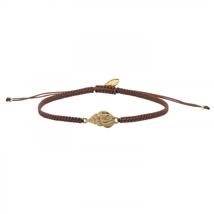 Inspiré d'un petit trésor ramassé sur nos plages, le bracelet grigri triton moka doré à l'or fin 24 carats orné d'un délicat coquillage monté sur macramé évoque l'Ile Maurice.