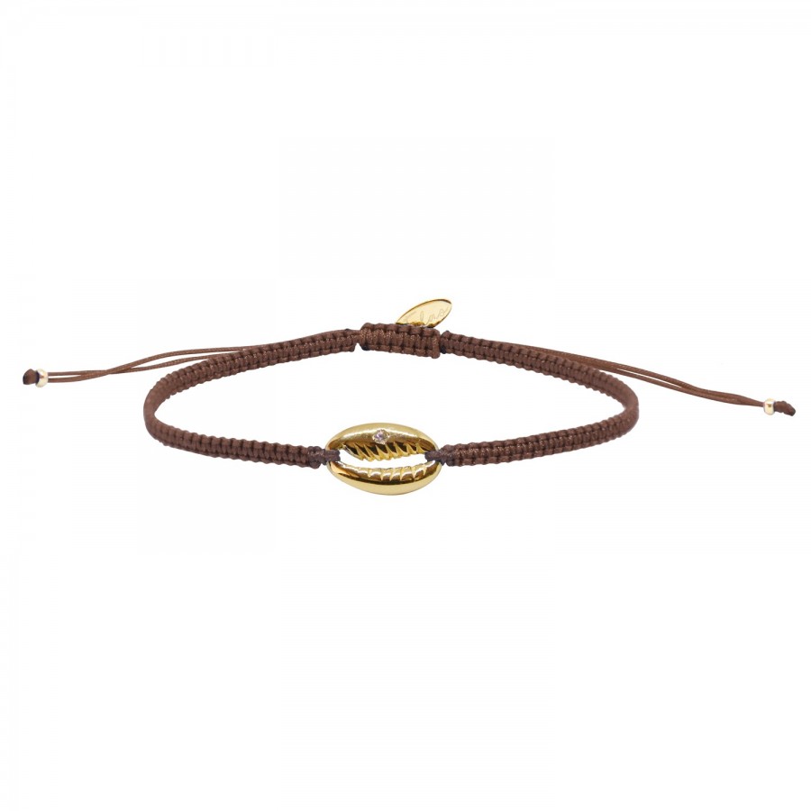 Le grigri coquille bonheur au délicat macramé moka et son coquillage serti d'un zirconium doré à l'or fin 24 carats est une douce évocation des Iles.