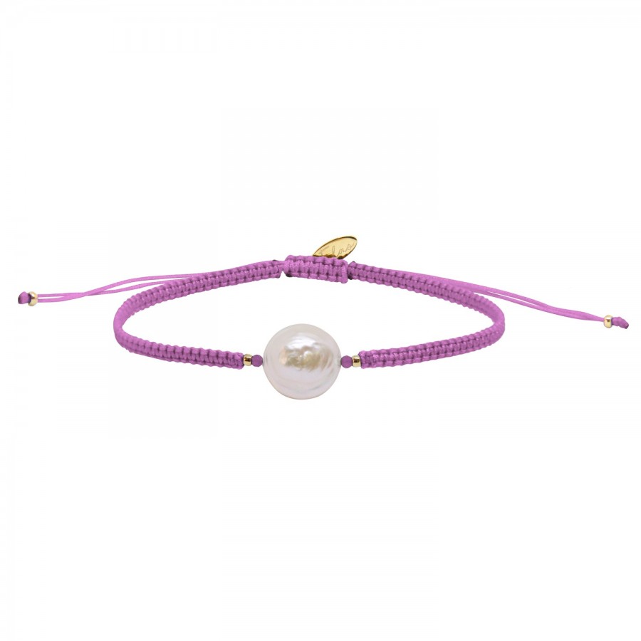 Un petit air des Iles pour ce bracelet au délicat tissage en macramé lilas orné d'une perle d'eau douce naturelle aux finitions dorées à l'or fin 24 carats.