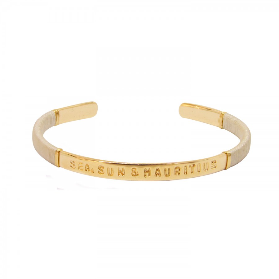 Le jonc Sea Sun & Mauritius Champagne doré à lor fin 24 carats capture la poésie des plages mauriciennes. Élégant et raffiné, il illumine le poignet avec douceur et chaleur estivale.