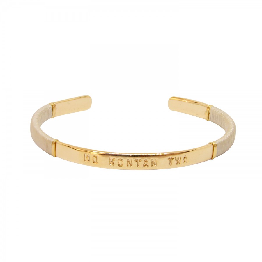 Le jonc Mo Kontan Twa Champagne doré à lor fin 24 carats sinspire de la chaleur douce et réconfortante des nuances vanille. Bijou poétique et raffiné, il illumine le poignet avec élégance et délicatesse.