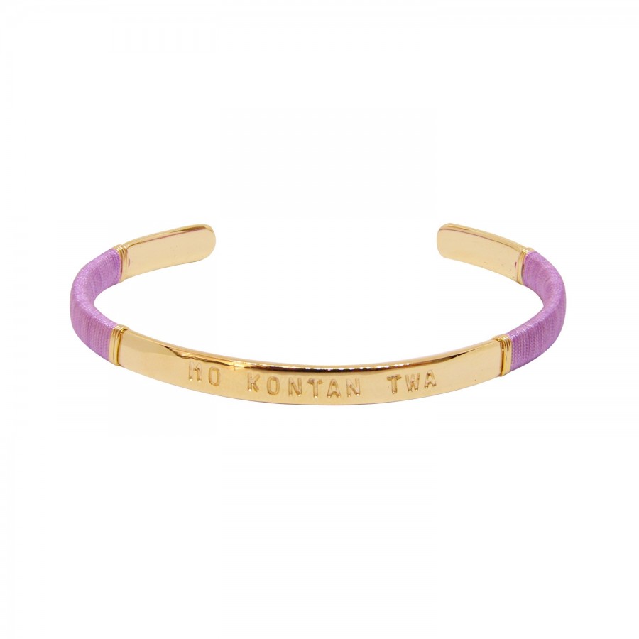 Le jonc Mo Kontan Twa Lilas doré à lor fin 24 carats sinspire des nuances violettes délicates du lilas. Bijou poétique et raffiné, il illumine le poignet avec élégance et subtilité.