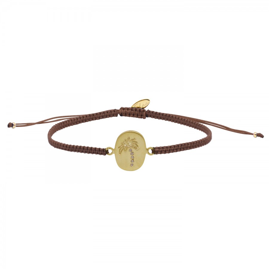 Chaleureux et poétique, le grigri Palm Moka doré à l'or 24 carats et serti de délicats zirconiums diffuse une lumière subtile au poignet.