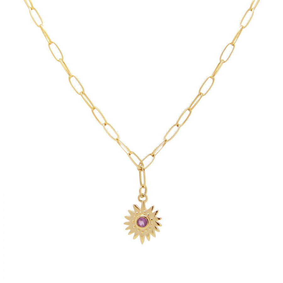 La chaîne Zenith Améthyste dorée à lor fin 24 carats sinspire des nuances violettes de lAméthyste et de la lumière délicate des pierres. Bijou poétique et raffiné, elle illumine votre visage avec élégance.